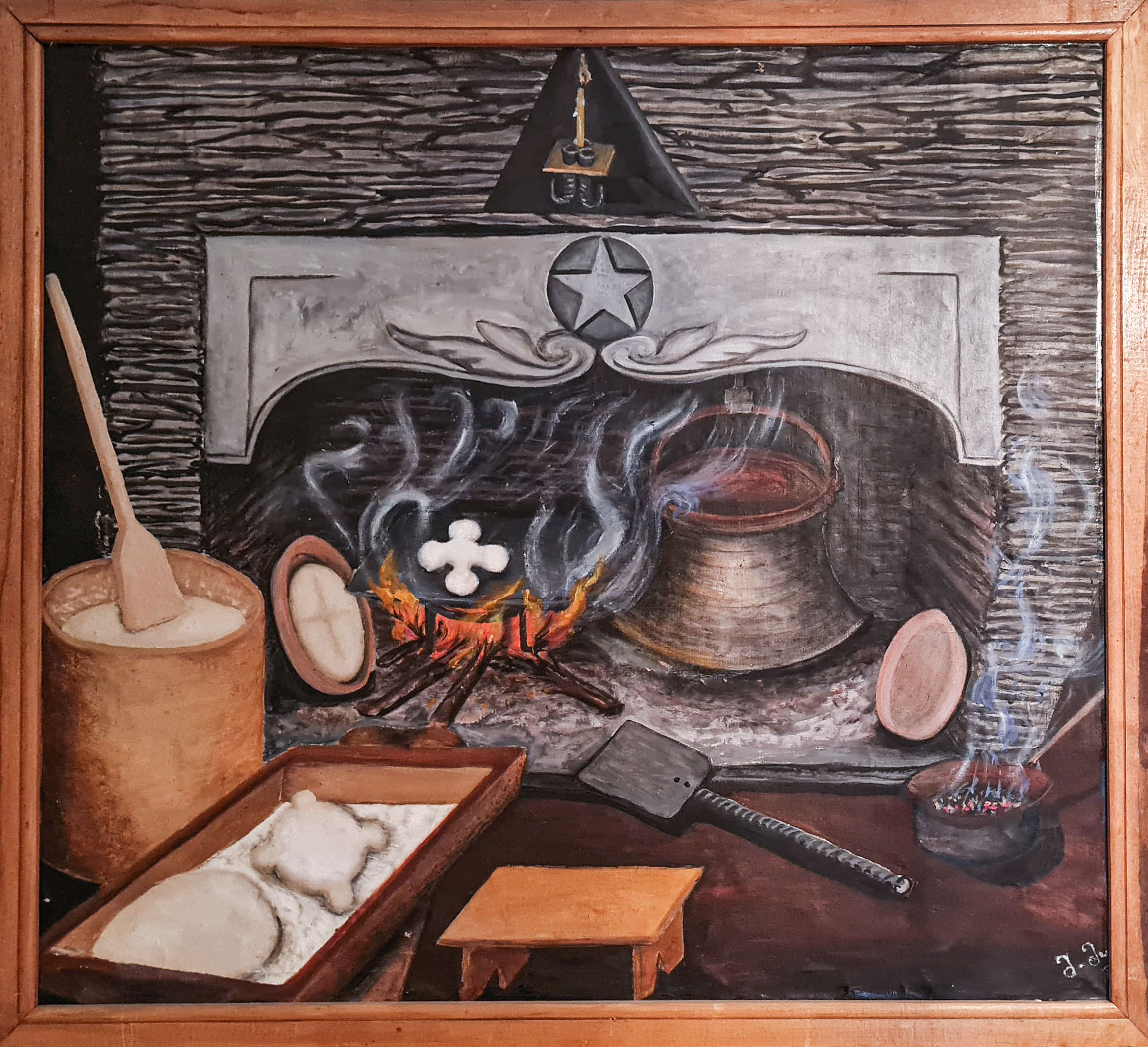 I have one painting on the subject of politics, in which I depicted the confrontation between the Soviet Union and the traditional way of life. This was one of my first works. I saw that there was a conflict with religion: churches were destroyed, the old, traditional religious rituals were forbidden. I didn’t like this. I had my family as an example—how they respected the traditions. At the same time, our family was also protecting icons of the local shrine. Politics and religion were in opposition to each other. I was thinking about how to paint this. “Politics” was represented by the shape of a star, which was a symbol of the Communists. In short, I painted our fireplace with a star on it. Below, in the fireplace, I showed the preparations for a religious ritual. How to paint politics? I thought about it for three months, and as soon as I came up with it, then suddenly everything became clear and the picture appeared in my mind. I would come from school at three o’clock, eat, and start painting until it got dark. I gave myself one month to complete it.