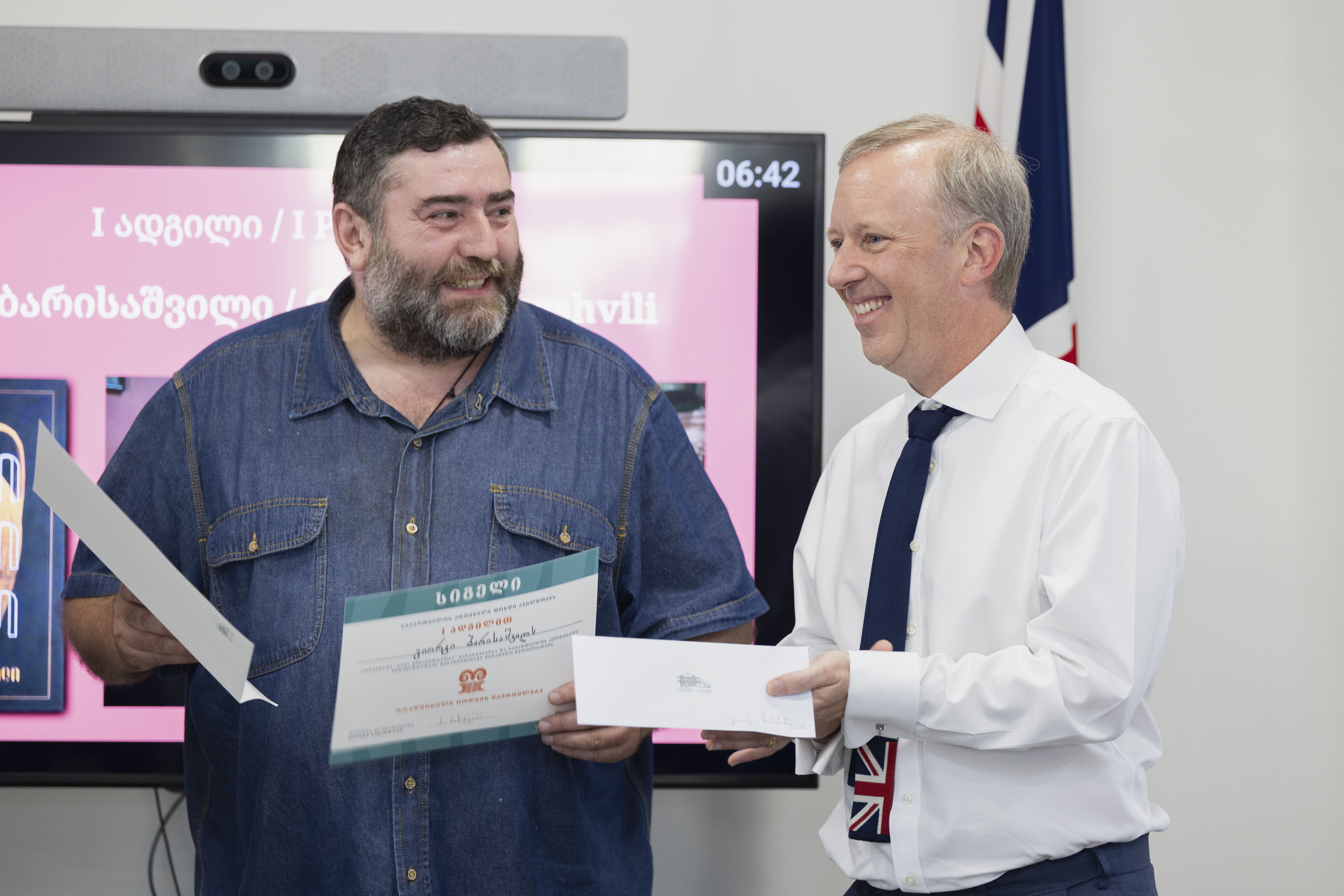 კულტურული მემკვიდრეობის კონკურსი. გამარჯვებულს აჯილდოვებს დიდი ბრიტანეთის ელჩი. ფოტო დიდი ბრიტანეთის საელჩო