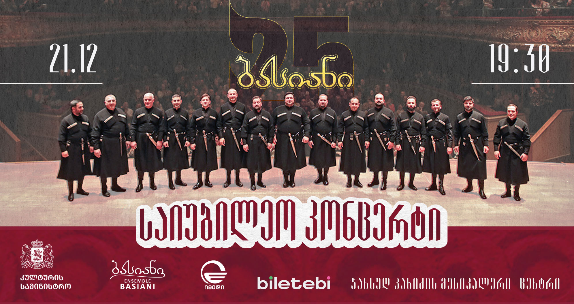 21 დეკემბერს, 19:30 საათზე, ჯანსუღ კახიძის სახელობის თბილისის მუსიკალურ-კულტურულ ცენტრში საქართველოს ხალხური სიმღერის სახელმწიფო ანსამბლი „ბასიანი'' 25 წლისადმი მიძღვნილ საიუბილეო სოლო კონცერტს გამართავს.