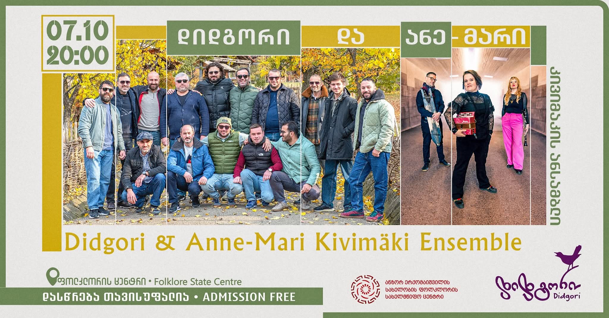 7 ოქტომბერს, 20:00 საათზე, ფოლკლორის ცენტრის გალერეაში ანსამბლ „დიდგორისა“ და ფინელი მუსიკოსების – ანე-მარი კივიმაკისა და მისი ტრიოს შეხვედრა გაიმართება. ღონისძიებაზე სტუმრები ქართულ და ფინურ ფოლკლორულ მუსიკას მოისმენენ, ასევე, შესაძლებლობა ექნებათ მუსიკოსებს მათთვის საინტერესო შეკითხვებიც დაუსვან. ღონისძიებაზე დასწრება თავისუფალია.
